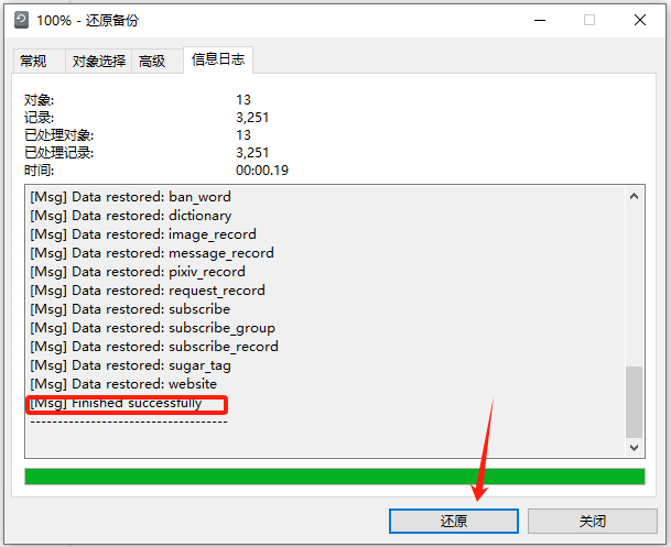 然后在弹出的界面中点击还原,当命令行出现这句话的时候,数据库就还原成功了
