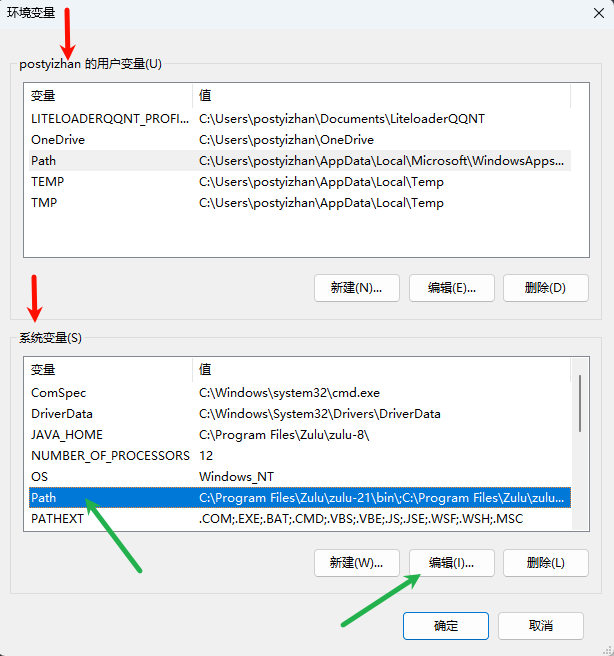 可以看到,在名为“编辑环境变量”的界面中,我安装包安装的两个 Java(zulu 8 和 zulu 21)都有环境变量(红框部分)。